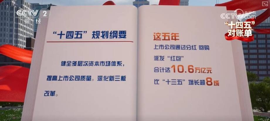 “十四五”规划纲要提出,健全多层次资本市场体系,提高上市公司质量,深化新三板改革。2025年8月,A股市场总市值首次突破100万亿元。这五年,上市公司通过分红、回购派发“红包”合计达到10.6万亿元,比“十三五”增长超过八成。